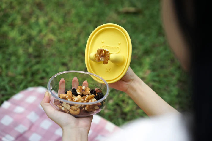 An all-in-one lunchbox, utensil and meal companion! Wear its silicone lid like a glove and snack anywhere, anytime without getting your fingers dirty. Now available in a refreshing, lemon-y yellow colour!